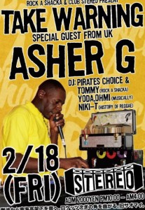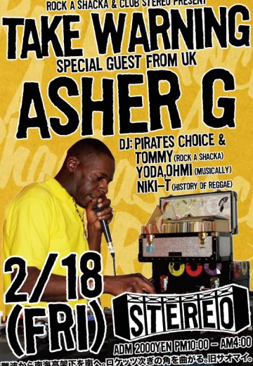 いよいよ Ahser Gby pirates_choiceSHOP2011/02/15いよいよ ASHER Gが来る。 今週の金曜日 TAKE WARNING!! Rock Steady ~ Roots Rock まで最高のリバイバル・セッションになるだろう。