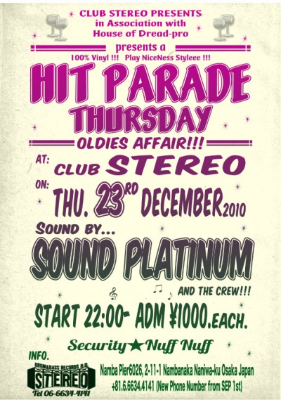 2010.12.23(Thu) [ Hit Parade Thursday ] at Club Stereoby nekomaSTEREO SCHEDULE2010/11/30 Hit Parade Thursday DJ: Sound Platinum Genre: Jamaican Dancehall ADM: 1000Yen 10:00PM〜3:00AM Map>>