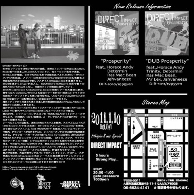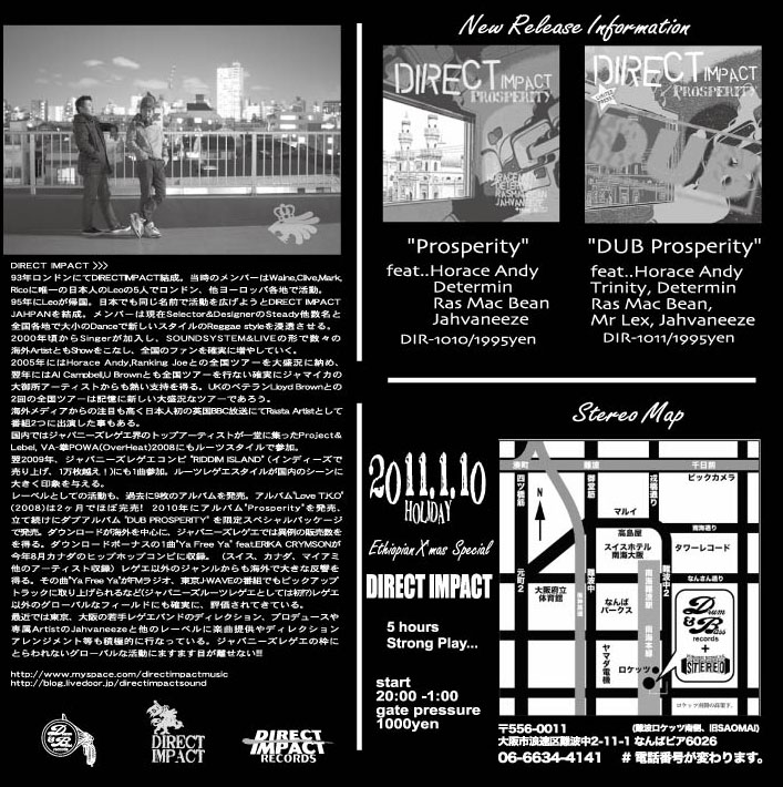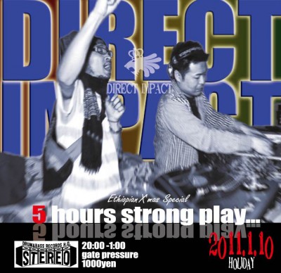 2011.1.10(Mon) [ Direct Impact -ethiopian X’mas Special 5hours Strong Play…- ] at Club Stereoby nekomaSTEREO SCHEDULE2011/01/05 2011.1.10(Monday) [ Direct Impact -Ethiopian X’mas Special 5Hours Strong Play…- ] DJ: Direct Impact Genre: Modern Roots, Revival Roots. Dub ADM: 1000Yen 8:00PM〜1:00AM