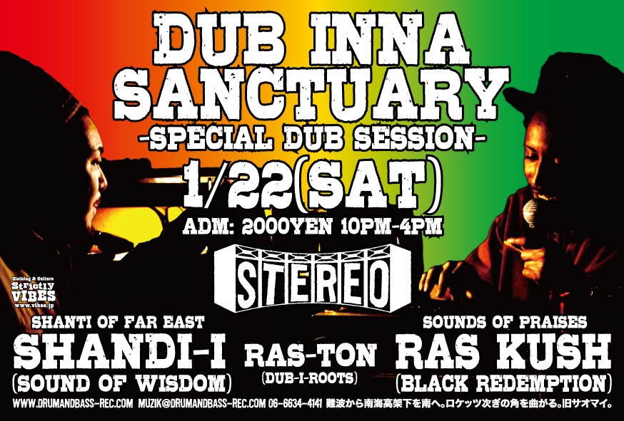 2011.1.22(Sat) [ Dub Inna Sanctuary ] at Club Stereoby nekomaSTEREO SCHEDULE2011/01/22 2011.1.22(Saturday) [ Dub Inna Sanctuary ] Special Guest from NY Ras Kush (Black Redemption) Shandi-I (Sound of Wisdom) Ras Ton (Dub-I-Roots) Genre: Modern Roots, Revival Roots ADM: 2000Yen 10:00PM〜4:00AM