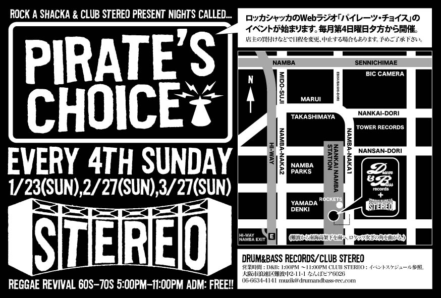 2011.2.27(Sun) [ Pirates Choice ] at Club Stereoby nekomaRADIO, STEREO SCHEDULE2011/01/09Rock A Shacka Webラジオ、パイレーツ・チョイスのイベントがクラブ・ステレオで始まります。毎月第4日曜日、夕方5時から。入場無料。 2011.2.27(Sunday) [ Pirates Choice ] DJ: Pirates Choice Genre: Reggae Revival 60’s-80’s ADM: FREE 5:00PM〜11:00PM
