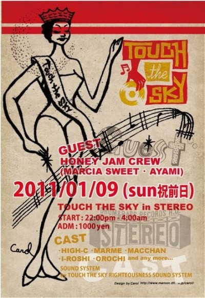 2011.1.9(Sun) [ Touch The Sky ] at Club Stereoby nekomaSTEREO SCHEDULE2011/01/08 2011.1.9(Sunday) [ Touch The Sky ] DJ: Guest Honey Jam Selector High-C, Marme, Macchan, I-Roshi, Orochi Genre: Roots Rock Revival 70’s – 90’s ADM: 1000Yen 10:00PM〜4:00AM