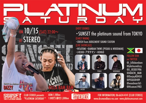 2011.10.15(Sat) [ Platinum Saturday ] SUNSET the platinum sound at Club Stereoby nekomaSTEREO SCHEDULE2011/09/27 2011.10.15(Saturday) [ Platinum Saturday ] DJ: Host Sound: Sun Set the platinum sound, Early Warm: Crush Live Showcase: Hisatomi,BamBam Twins(Pequu & Woodman),J-Rexxx,アダチマン,Kohgo Genre: Dancehall ADM: 1500Yen (1PMまで入場の方: 1000Yen) 10:00PM〜