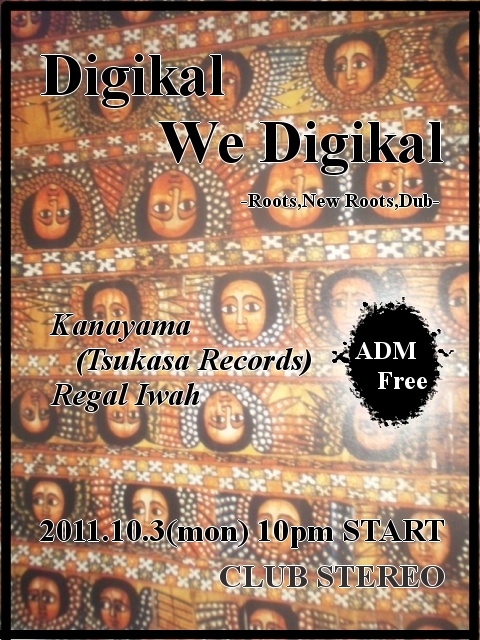 2011.10.3(Mon) [ Digikal We Digikal ] at Club Stereoby nekomaSTEREO SCHEDULE2011/09/21 2011.10.3(Monday) [ Digikal We Digikal ] DJ: kanayama,Regal Iwah Genre: Revival Roots, Digital Roots, New Roots ADM: FREE 10:00PM〜