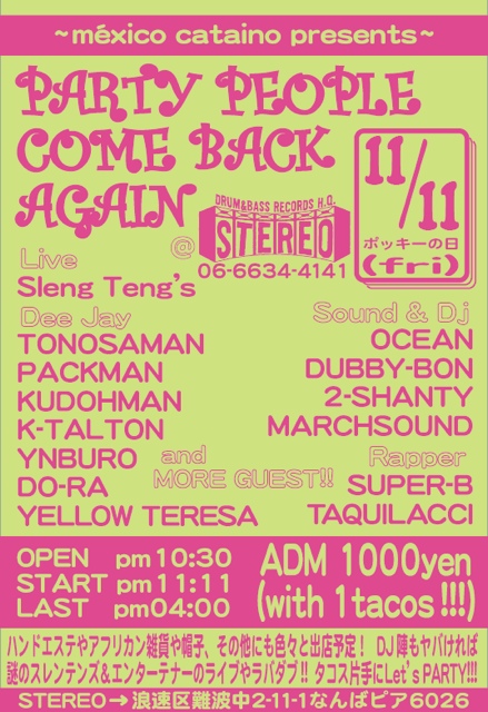 2011.11.11(Fri) [ Party People Come Back Again ] at Club Stereoby nekomaSTEREO SCHEDULE2011/10/28 2011.11.11(Friday) [ Party People Come Back Again ] Live: スレンテンズ with 殿様男, Kudohman, Packman and more DJ: Ocean, 2 Shanti, Dubby Bon Food: メヒコキャッタイ〜ノ and more Genre: Dancehall Classics ADM: 1000Yen(1タコス) 10:00PM〜
