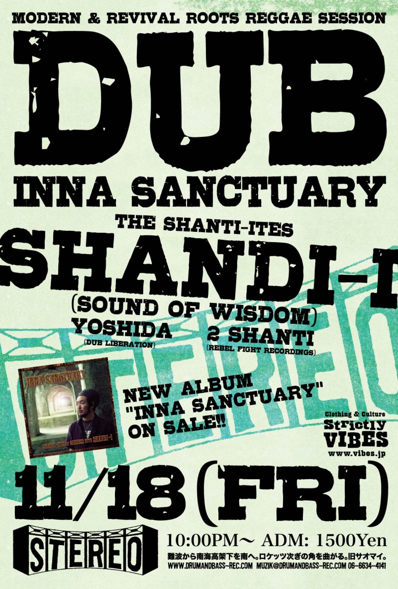 2011.11.18(Fri) [ Dub Inna Sanctuary ] Shandi-I at Club Stereoby nekomaSTEREO SCHEDULE2011/10/31 2011.11.18(Friday) [ Dub Inna Sanctuary ] Shandi-I(Sound of Wisdom) Original Kose急遽参戦決定。 Yoshida(Dub Liberation) 2Shanti(Rebel Fight Recordings) Genre: Modern Roots, Revival Roots ADM: 1500Yen 10:00PM〜