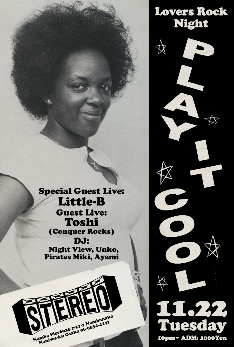 2011.11.22(Tue) [ Play It Cool ] at Club Stereoby nekomaSTEREO SCHEDULE2011/10/28 2011.11.22(Tuesday: 祝前) [ Play It Cool ] SP Guest Live:Little-B Guest Live:Toshi(Conquer Rocks) Dj:Night View,Unko,Pirates Miki,Ayami Genre: Lovers Rock ADM: 1000Yen 10:00PM〜