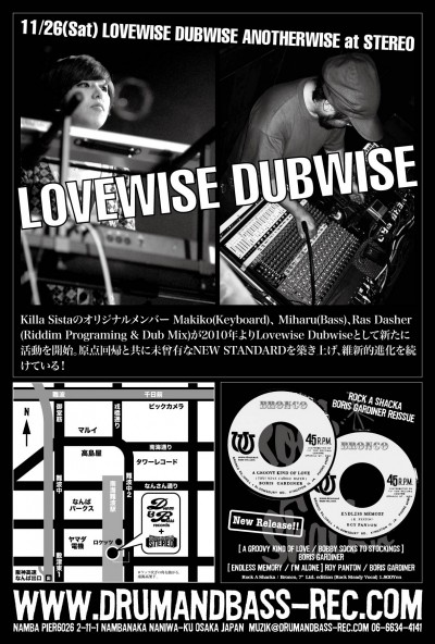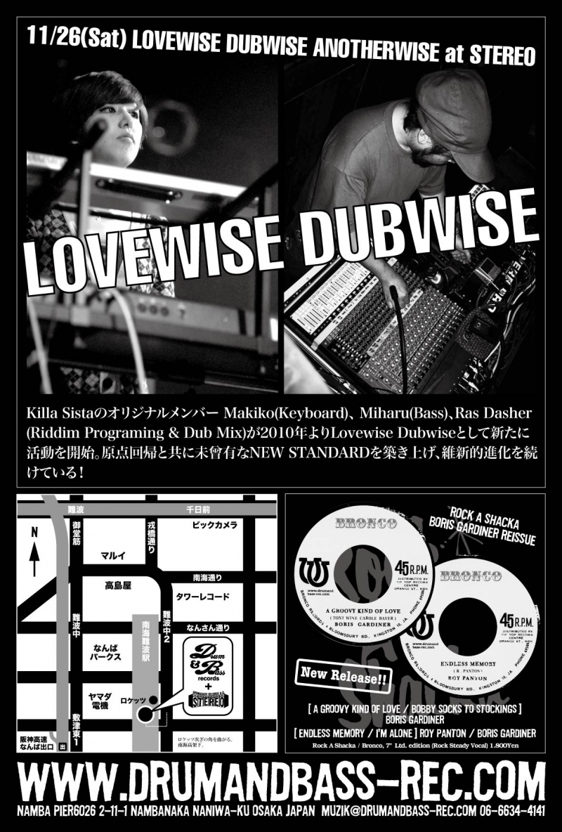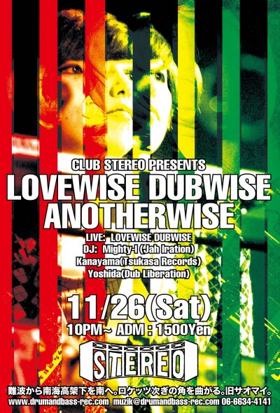 2011.11.26(Sat) [ Lovewise Dubwise Anotherwise ] at Club Stereoby nekomaSTEREO SCHEDULE2011/10/08 2011.11.26(Saturday) [ Lovewise Dubwise Anotherwise ] Live: Lovewise Dubwise DJ: Mighty-I(Jah Iration), Kanayama(Tsukasa Records), Yoshida(Dub Liberation) Genre: Roots Rock, Dubwise ADM: 1500Yen 10:00PM〜