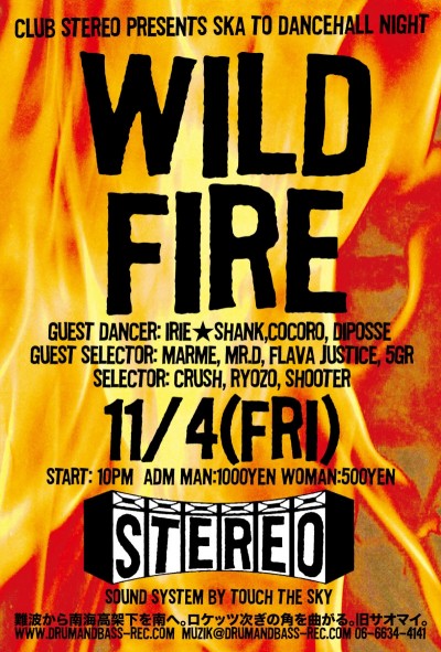 2011.11.4(Fri) [ Wild Fire ] at Club Stereoby nekomaSTEREO SCHEDULE2011/11/01 2011.11.4(Friday) [ Wild Fire ] Guest Dancer: Irie★Shank, COCORO, DIPosse Guest Selector: Marme, Mr.D, Flava Justice, 5GR Selector: Crush, Ryozo, Shooter Genre: Dancehall Classics 80’s & 90’s ADM: Man 1000Yen Woman 500Yen 10:00PM〜