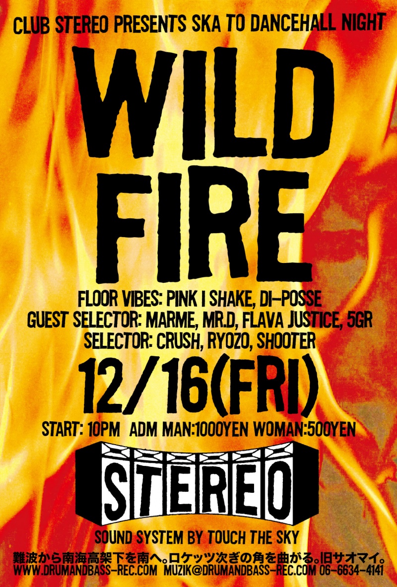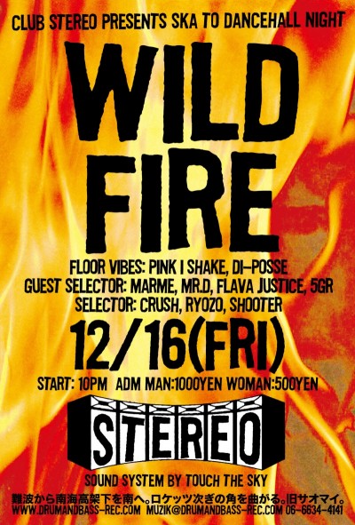 2011.12.16(Fri) [ Wild Fire ] at Club Stereoby nekomaSTEREO SCHEDULE2011/12/09 2011.12.16(Friday) [ Wild Fire ] Floor Vibes:Pink I Shake Guest Selector: Marme, Mr.D, Flava Justice, 5GR Selector: Crush, Ryozo, Shooter Genre: Dancehall Classics 80’s & 90’s ADM: Man 1000Yen Woman 500Yen 10:00PM〜