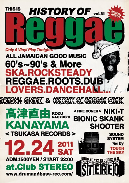 2011.12.24(Sat) [ History Of Reggae -Christmas Special- ] 高津直由,Kanayama at Club Stereoby nekomaSTEREO SCHEDULE2011/11/26 2011.12.24(Saturday) [ History Of Reggae ] Guest: 高津直由,Kanayama DJ: Bionic Skank,Niki-T,Shooter Genre: Ska to Dancehall ADM: Man 1000Yen Woman 500Yen 10:00PM〜