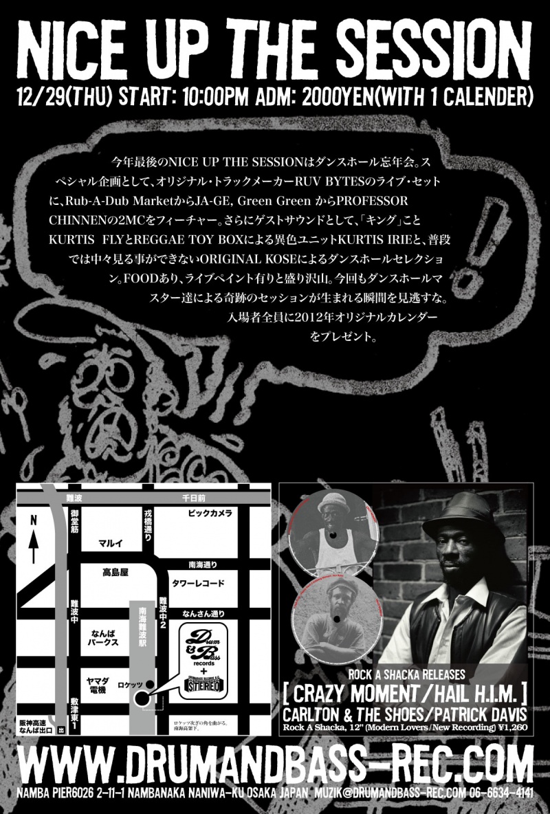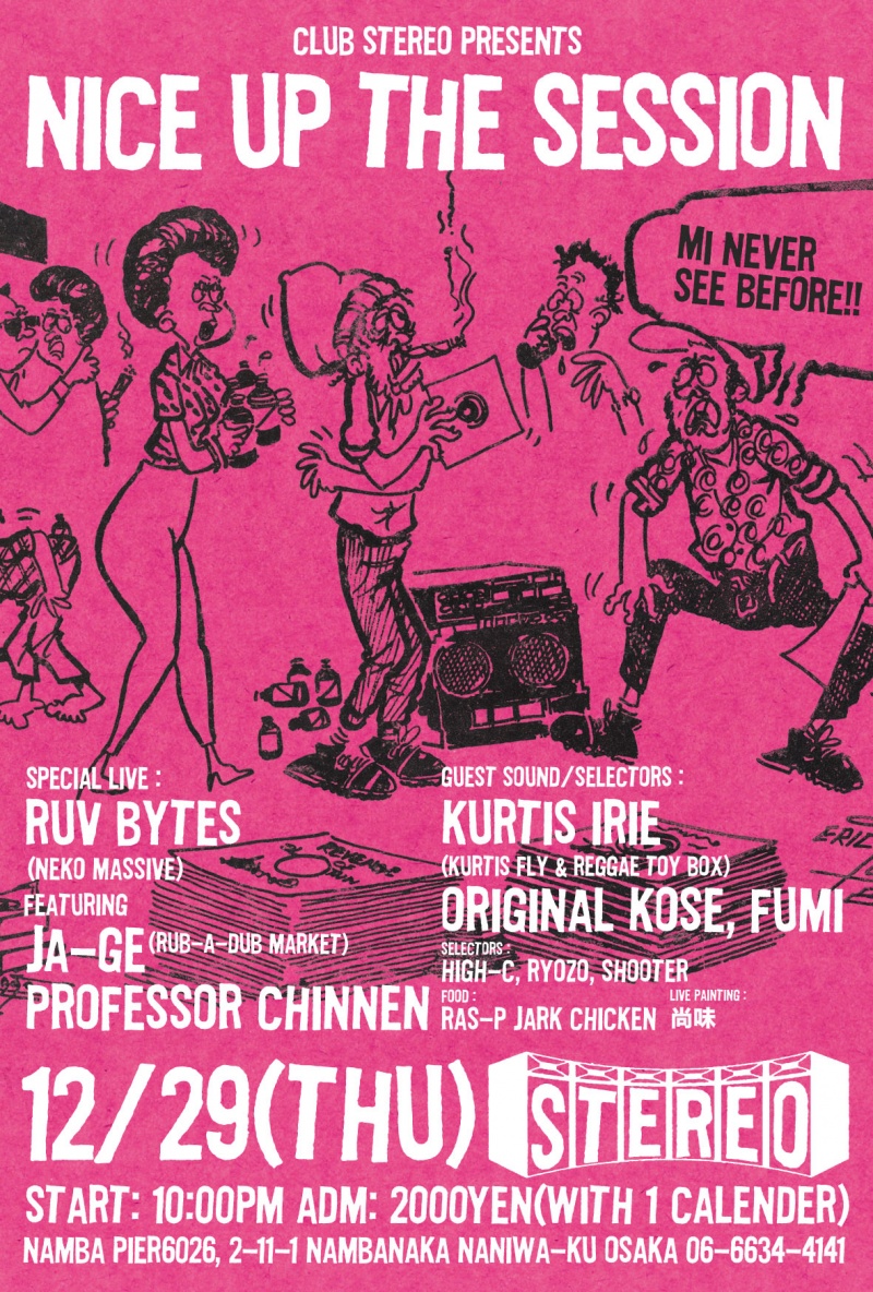 今年最後のNICE UP THE SESSIONはダンスホール忘年会。スペシャル企画として、オリジナル・トラックメーカーRUV BYTESのライブ・セットに、Rub-A-Dub MarketからJA-GE, Green Green からPROFESSOR CHINNENの2MCをフィーチャー。さらにゲストサウンドとして、「キング」ことKURTIS FLYとREGGAE TOY BOXによる異色ユニットKURTIS IRIEと、普段では中々見る事ができないORIGINAL KOSEによるダンスホールセレクション。FOODあり、ライブペイント有りと盛り沢山。今回もダンスホールマスター達による奇跡のセッションが生まれる瞬間を見逃すな。入場者全員に2012年オリジナルカレンダーをプレゼント。