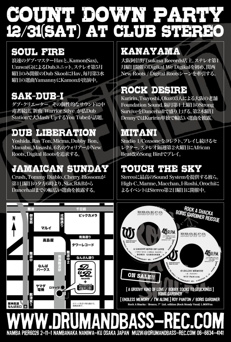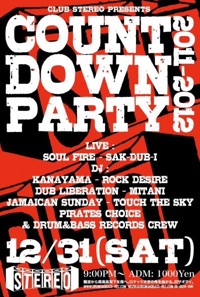 2011.12.31(Sat) [ Count Down Party 2011-2012 ] at Club Stereoby nekomaSTEREO SCHEDULE2011/12/09 2011.12.31(Saturday) [ Count Down Party ] Live: Soul Fire,Sak-Dub-I DJ: Kanayama, Rock Desire, Dub Liberation Mitani, Jamaican Sunday, Touch The Sky Pirates Choice and D&B Crew ADM: 1000Yen 9:00PM〜