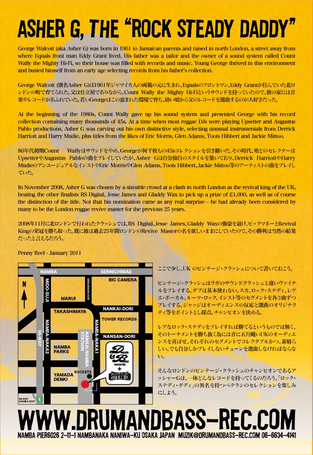 そんなロンドンのビンテージ・クラッシュのチャンピオンであるアッシャーGは、一体どんなレコードを持ってくるのだろう。「ロック・ステディ・ダディ」の異名を持つベテランのセレクションを楽しみにしよう。