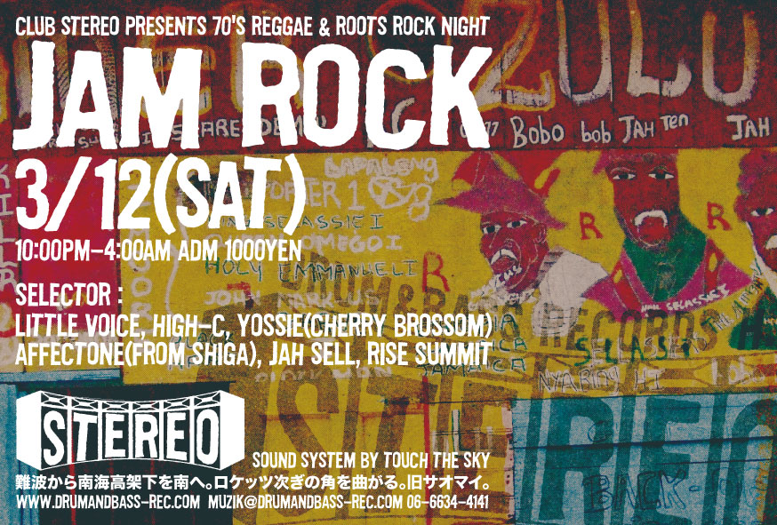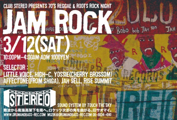 2011.3.12(Sat) [ Jam Rock ] at Club Stereoby nekomaSTEREO SCHEDULE2011/03/04 2011.3.12(Saturday) [ Jam Rock ] DJ: Little Voice, High-C, Yossie(Cherry Brossom), Affectone from Shiga, Jah Sell, Rise Summit Genre: 70’s Reggae &Roots Rock Night ADM: 1000Yen 10:00PM〜4:00AM
