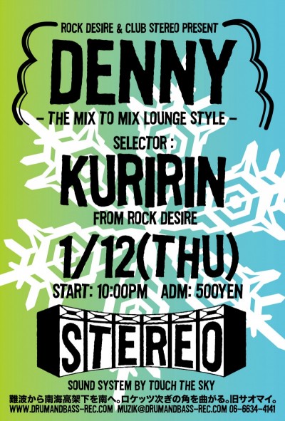 2012.1.12(Thu) [ “denny” – The Mix To Mix Lounge Style ] at Club Stereoby nekomaSTEREO SCHEDULE2011/12/19 2012.1.12(Thursday) [ “Denny” – the mix to mix lounge style ] Kuririn, Oku from Rock Desire Genre: Dancehall & More ADM: 500Yen 10:00PM〜