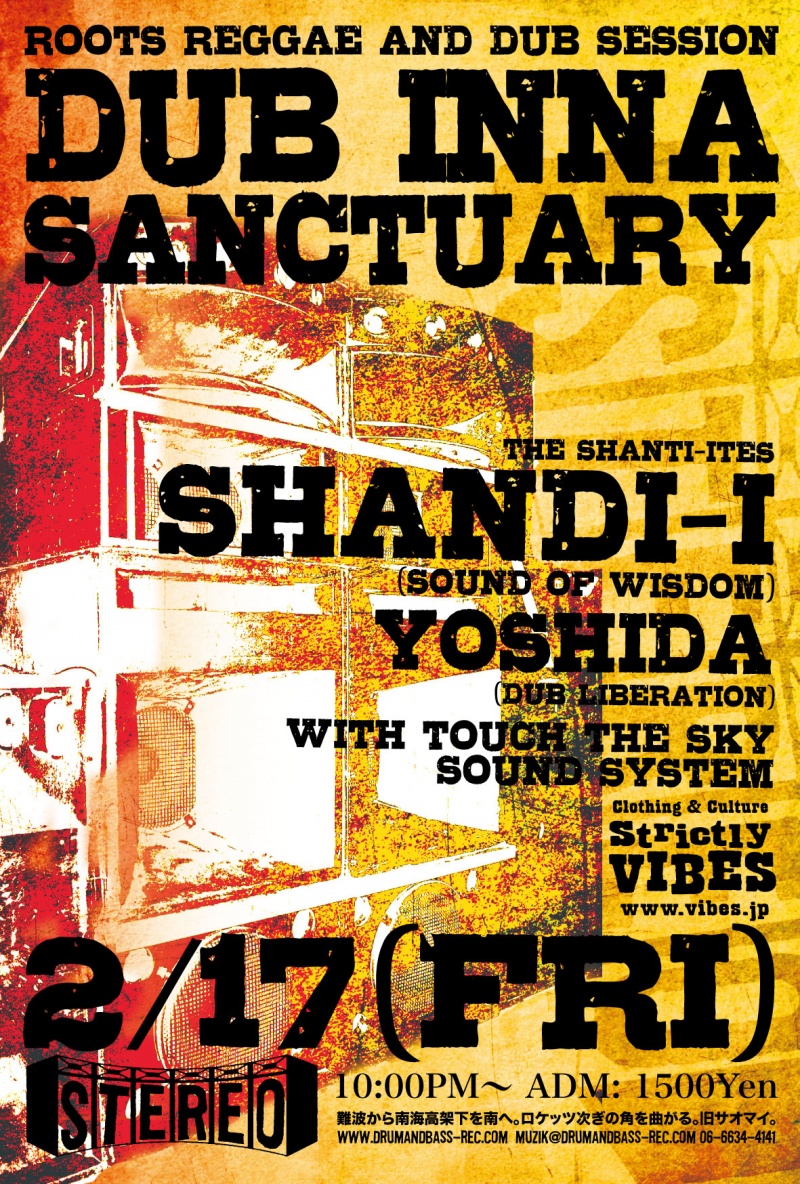 2012.2.17(Fri) [ Dub Inna Sanctuary ] at Club Stereoby nekomaSTEREO SCHEDULE2012/01/24CLUB STEREOで行われる「DUB INNA SANCTUARY」につきまして、SHANDI-Iの体調不良により出演出来なくなりました。キャスト内容が変更されます。 2012.2.17(Friday) [ Dub Inna Sanctuary ] DJ: Shandi-I, Yoshida(Dub Liberation) Genre: Modern Roots, Revival Roots ADM: 1500Yen 10:00PM〜