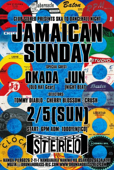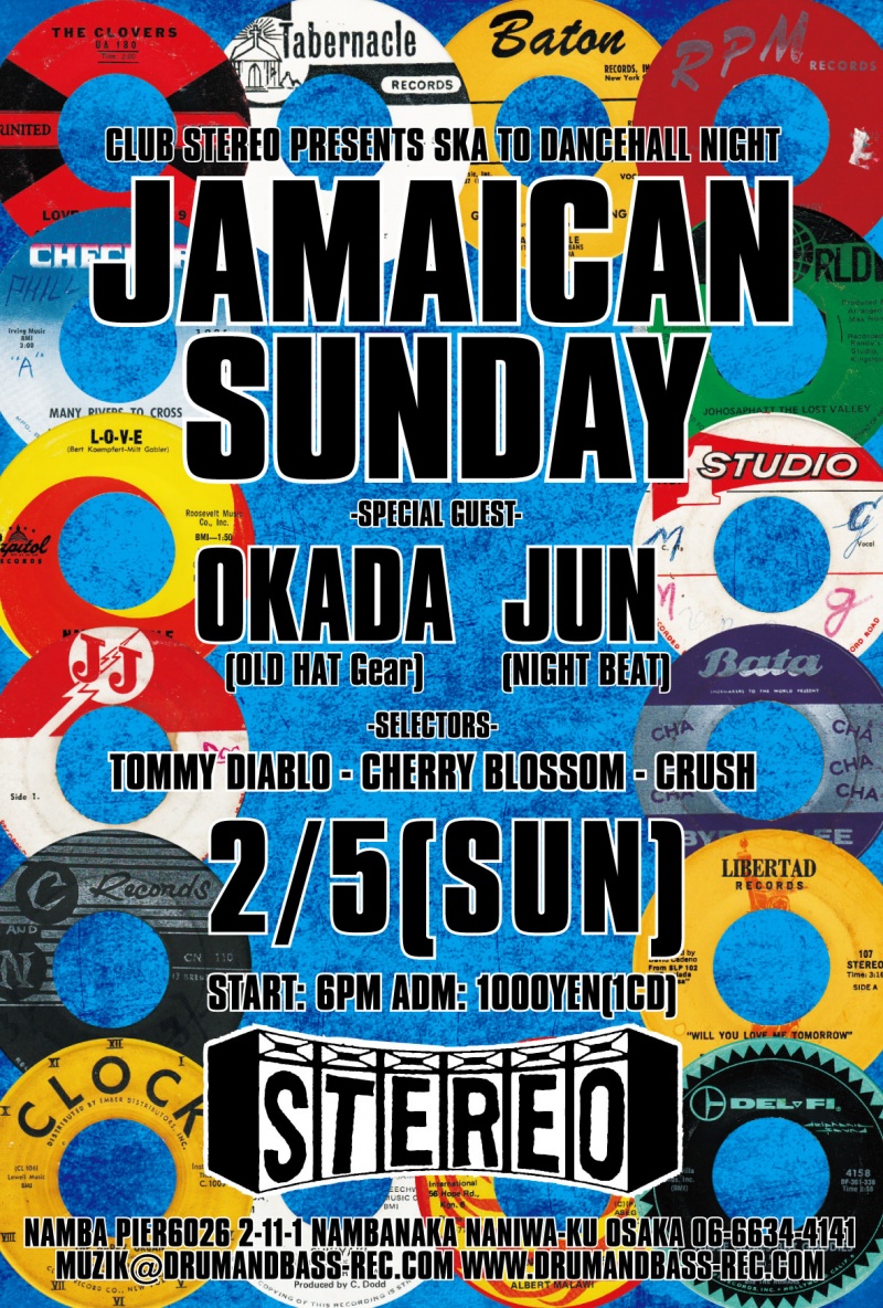 2012.2.5(Sun) [ Jamaican Sunday ] at Club Stereoby nekomaSTEREO SCHEDULE2012/01/24 2012.2.5(Sunday) [ Jamaican Sunday ] Special Guest: Oka-D , Jun DJ: Tommy Diablo , Cherry Blossom & Crush Genre: Ska to Dancehall,Soul, R&B ADM: 1000Yen(1CD) 6:00PM〜